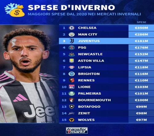 北京时间1月7日,德转列出了过去5年冬窗引援支出排行榜,切尔西3.5亿欧元高居第一,曼城2.86亿欧元第二,尤文图斯1.81亿欧元第三。